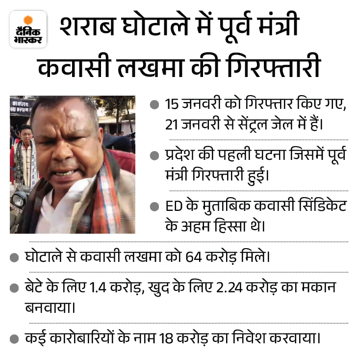 छत्तीसगढ़ शराब घोटाले की जांच कर रही एजेंसी प्रवर्तन निदेशालय ( ​​​​​ED) ने 15 जनवरी 2025 को आबकारी मंत्री कवासी लखमा को गिरफ्तार किया था। ED ने रिमांड पर उनसे 7 दिन पूछताछ की। इसके बाद 21 जनवरी को उन्हें न्यायिक रिमांड पर जेल भेजा गया। तभी से वे रायपुर सेंट्रल में जेल में बंद हैं।