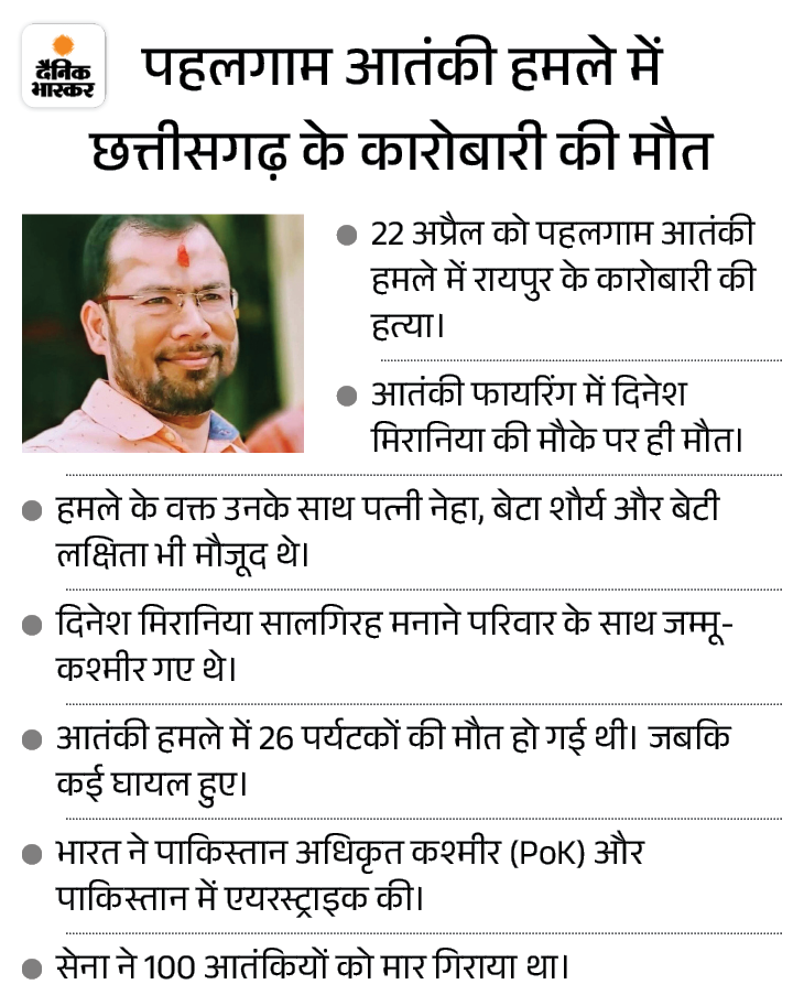 आतंकियों ने धर्म और नाम पूछकर छत्तीसगढ़ की रायपुर में रहने वाले कारोबारी दिनेश मिरानिया को गोली मार दी थी, जिससे उनकी मौके पर ही मौत हो गई थी। हमले के वक्त उनके साथ पत्नी नेहा, बेटा शौर्य और बेटी लक्षिता भी मौजूद थे। बता दें कि रायपुर की समता कॉलोनी में रहने वाले दिनेश मिरानिया अपनी शादी की सालगिरह मनाने परिवार के साथ जम्मू-कश्मीर गए थे।