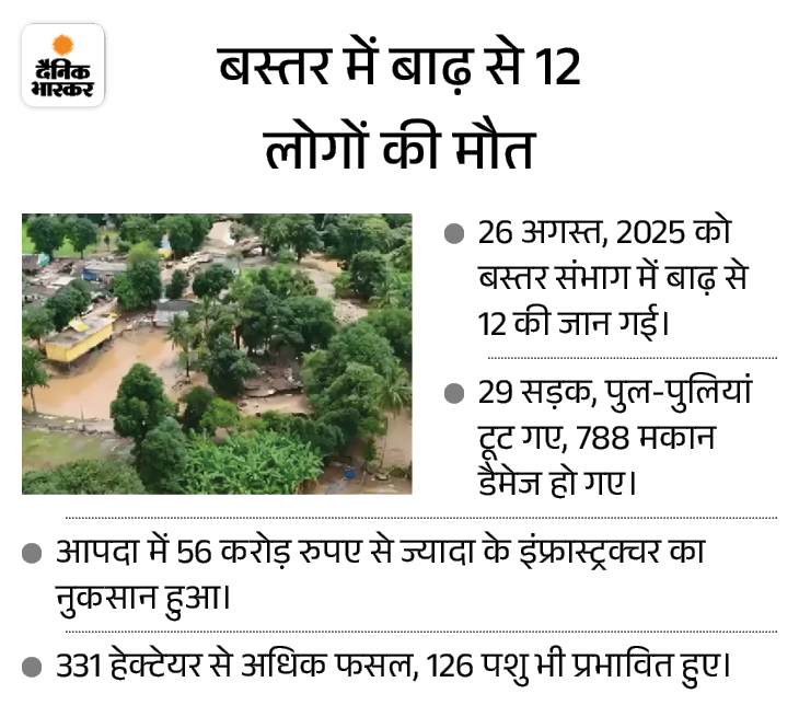 26 अगस्त, 2025 छत्तीसगढ़ के बस्तर संभाग का दंतेवाड़ा जिला बाढ़ की चपेट में आया। इसमें 12 लोगों की मौत हुई थी। शहर और गांव पानी में डूब गए, पुल टूट गए, पूरे घर और सालों की मेहनत का सामान बह गया। जहां कभी हरी-भरी फसलें लहलहा रही थीं, वो खेत अब नदी की रेत में दबे गए थे। इस बाढ़ से 91 गांव प्रभावित हुए ।