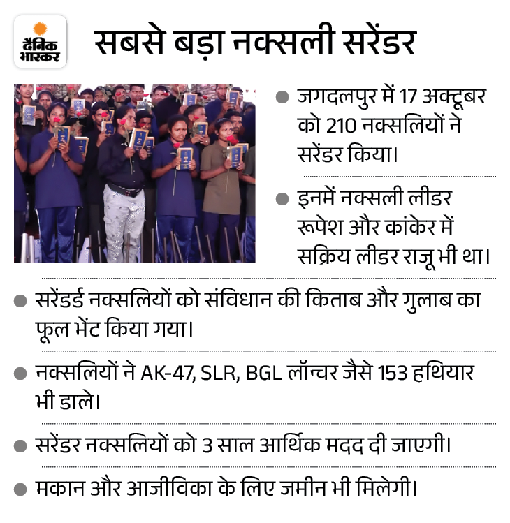 17 अक्टूबर को 210 नक्सलियों का सबसे बड़ा सरेंडर। इस दौरान उन्हें संविधान की किताब और गुलाब भेंट किया गया।