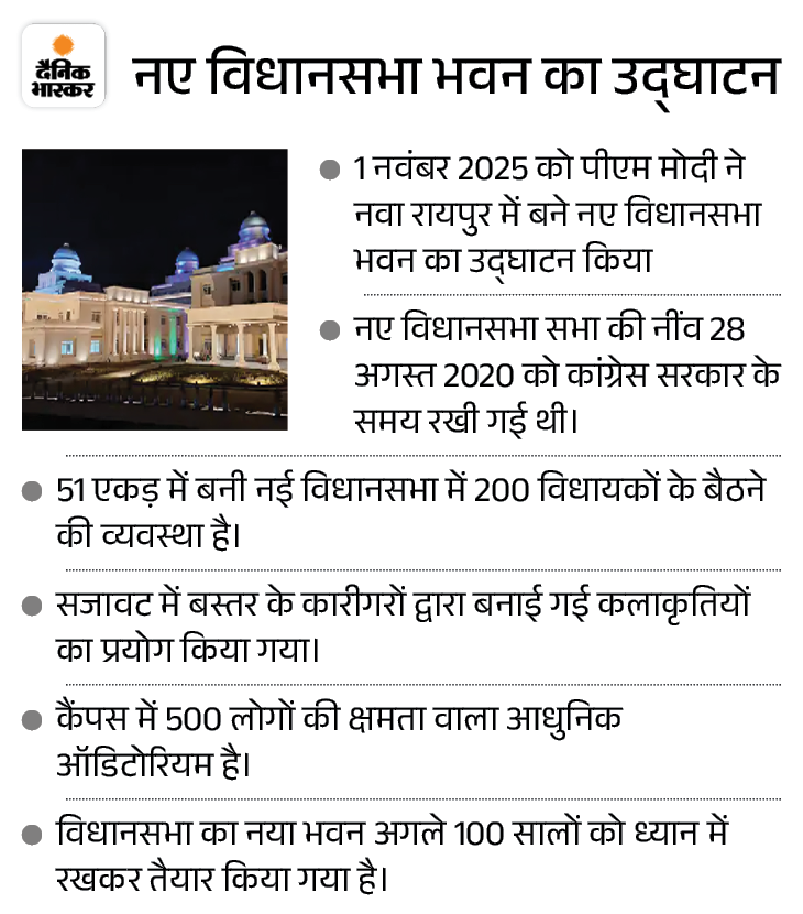 1 नवंबर 2025 को छत्तीसगढ़ राज्य स्थापना दिवस पर प्रधानमंत्री नरेंद्र मोदी ने नवा रायपुर में बने नए विधानसभा भवन का उद्घाटन किया था। इस नए विधानसभा सभा की नींव 28 अगस्त 2020 को कांग्रेस सरकार के समय रखी गई थी।