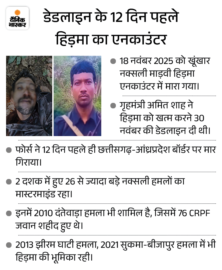 18 नवंबर 2025 को देश के सबसे खतरनाक नक्सल कमांडरों में शामिल माड़वी हिड़मा छत्तीसगढ़-आंध्र प्रदेश बॉर्डर पर मारेडमिल्ली जंगल में एनकाउंटर में मारा गया। उसकी पत्नी राजे उर्फ रजक्का और 4 अन्य नक्सली भी ढेर कर दिए गए थे।