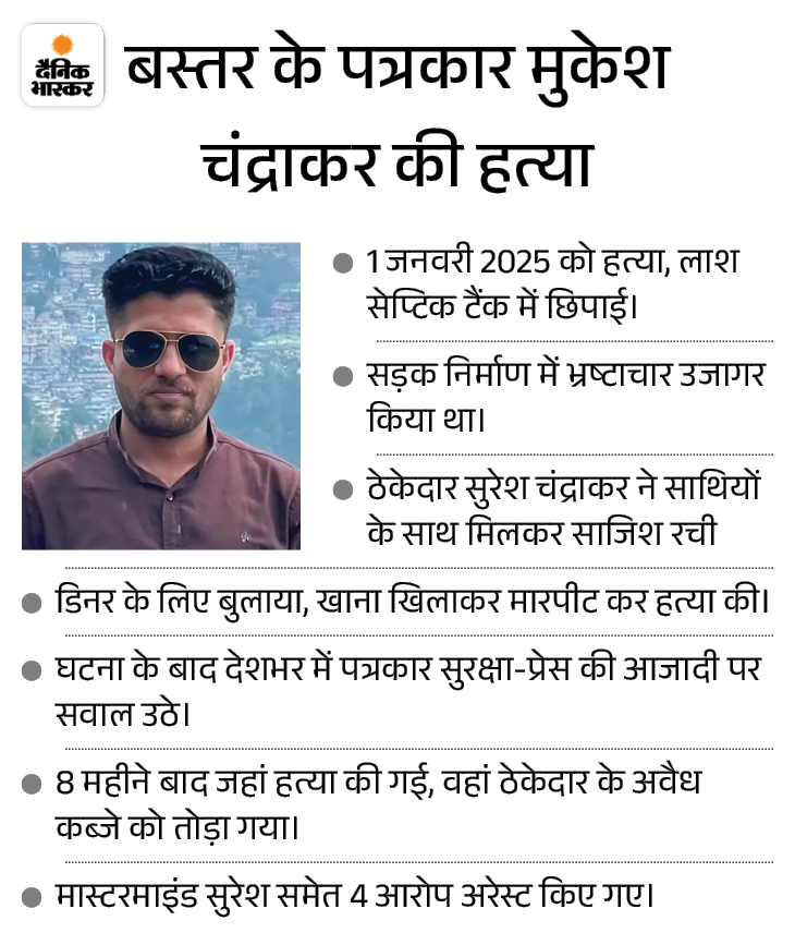 2025 की शुरुआत लोगों को झकझोर देने वाली घटना से हुई। 1 जनवरी 2025 को छत्तीसगढ़ के बीजापुर के पत्रकार मुकेश चंद्राकर (33) की हत्या कर दी गई थी। उनकी लाश सेप्टिक टैंक में छिपाई गई थी।