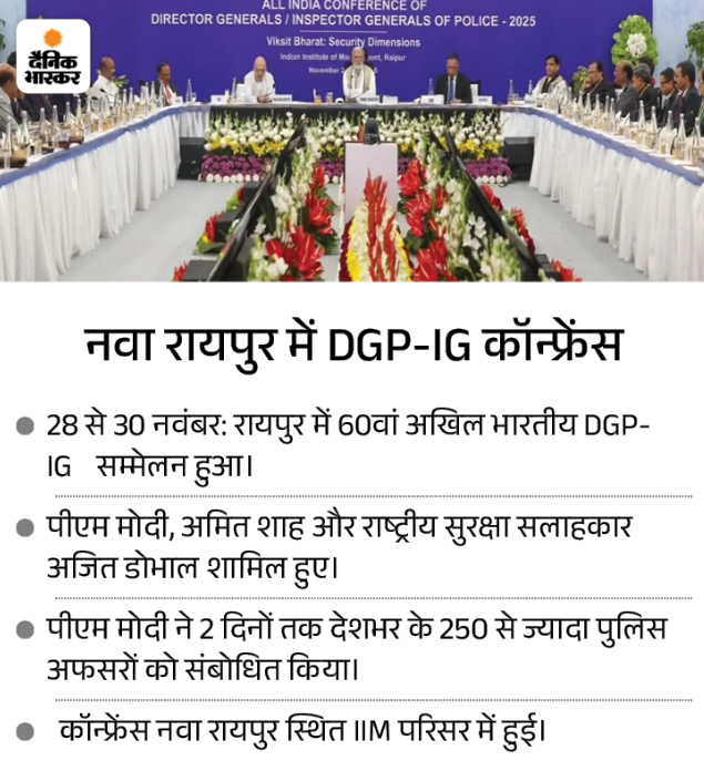 28 से 30 नवंबर को रायपुर में 60वां अखिल भारतीय DGP-IGP सम्मेलन हुआ। प्रधानमंत्री नरेंद्र मोदी, केंद्रीय गृहमंत्री अमित शाह और राष्ट्रीय सुरक्षा सलाहकार अजित डोभाल की मौजूदगी में हुई यह कॉन्फ्रेंस नवा रायपुर स्थित IIM परिसर में हुई।