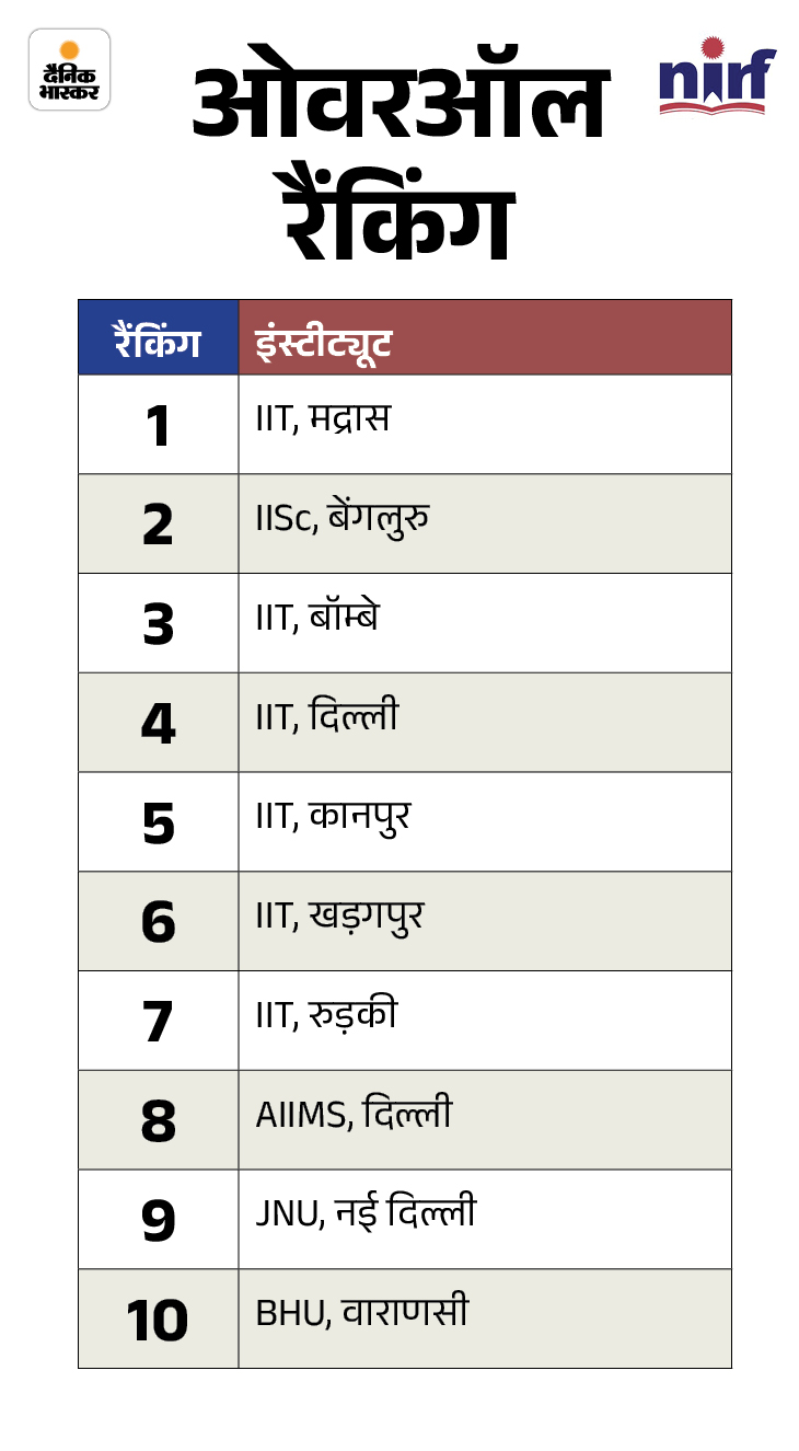 • ओवरऑल कैटेगरी में IIT मद्रास बेस्‍ट इंस्टीट्यूट बना है, जबकि IISc बेंगलुरु और IIT बॉम्‍बे दूसरे और तीसरे स्‍थान पर हैं।
