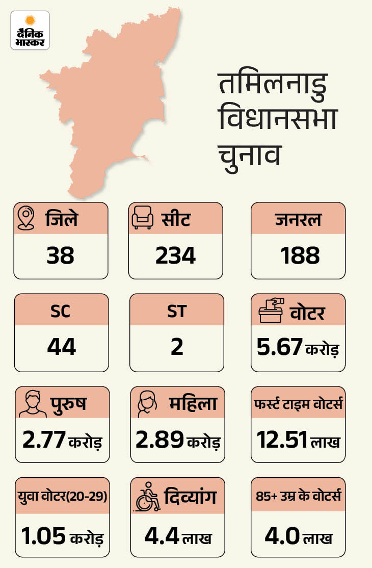 तमिलनाडु- भाजपा-कांग्रेस 60 साल से यहां सत्ता में नहीं आ सकीं: आजादी के बाद लगभग दो दशक तक यहां कांग्रेस की सरकार रही। 1967 के विधानसभा चुनाव में कांग्रेस हार गई और इसके साथ ही राज्य की राजनीति में बड़ा बदलाव आया। 1967 के बाद से तमिलनाडु की राजनीति मुख्य रूप से AIADMK और DMK के बीच घूमती रही है।