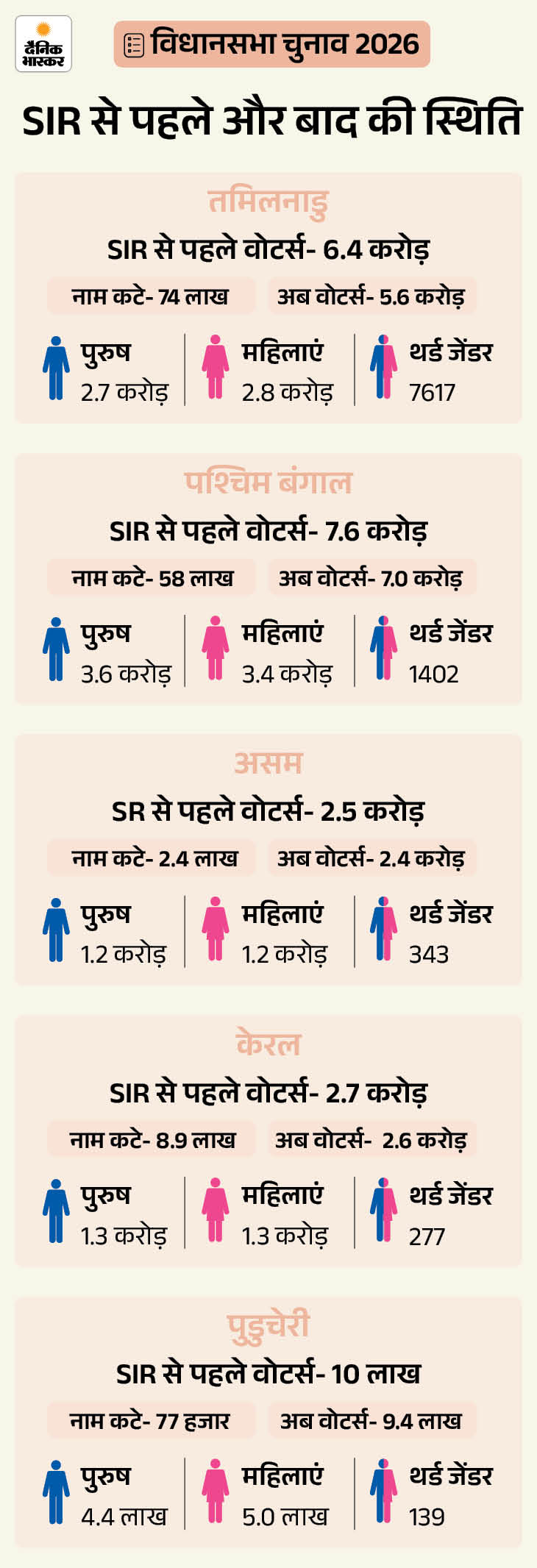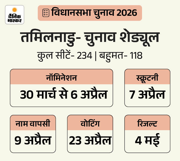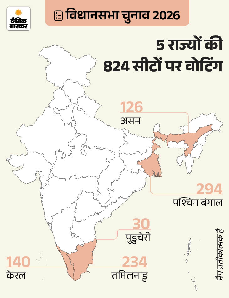 जिन पांच राज्यों में चुनाव होने जा रहे हैं, उनमें SIR के बाद तमिलनाडु से सबसे ज्यादा वोटर्स के नाम कटे हैं। चुनाव आयोग ने बताया कि 27 अक्टूबर 2025 को SIR प्रक्रिया शुरू होने के दौरान राज्य में कुल 6,41,14,587 वोटर थे। करीब चार महीने चली SIR में 74,07,207 लोगों के नाम हटाए गए हैं। राज्य में अब 5,67,07,380 मतदाता पंजीकृत हैं।