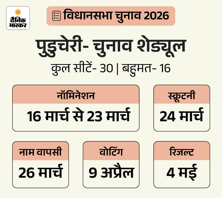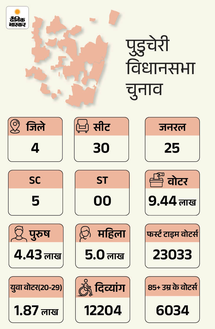 पुडुचेरी- सबसे कम सीटों वाली विधानसभा: 2021 में कांग्रेस सरकार गिरने के बाद AINRC-BJP गठबंधन ने सत्ता हासिल की और एन. रंगास्वामी एक बार फिर मुख्यमंत्री बने। यह पहली बार था जब BJP सत्ता में सीधे तौर पर भागीदार बनी। इस बार कांग्रेस DMK के साथ गठबंधन में वापसी की कोशिश कर रही है और सरकार गिरने के मुद्दे को एंटी-इनकम्बेंसी में बदलना चाहती है।