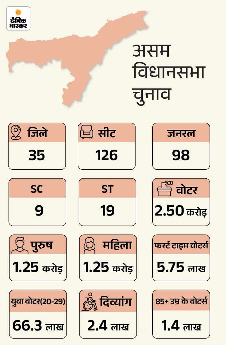 असम- कांग्रेस ने किया 8 पार्टियों से अलायंस: राज्य में 10 साल से भाजपा की सरकार है। पार्टी तीसरे चुनाव की तैयारियों में जुटी है। पीएम मोदी 6 महीने में 3 बार राज्य का दौरा कर चुके हैं। यहां पार्टी ने 126 सीटों में से 100+ सीटें जीतने का टारगेट रखा है। असम में बांग्लादेश, घुसपैठियों/सीमा सुरक्षा, असमिया पहचान जैसे मुद्दे हैं। भाजपा को रोकने के लिए कांग्रेस ने 10 पार्टियों के साथ गठबंधन किया है। इसमें वामपंथी और क्षेत्रीय दल शामिल हैं।