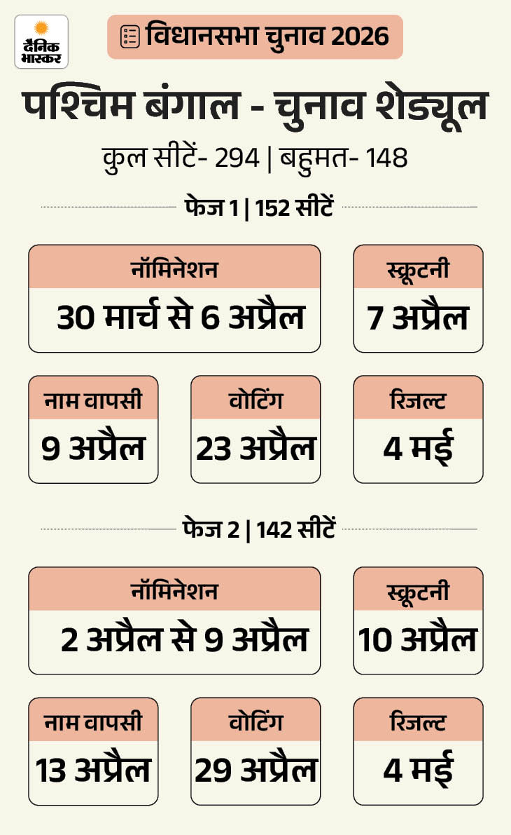 चुनाव आयोग ने 15 मार्च को असम, केरल, पुडुचेरी, तमिलनाडु और पश्चिम बंगाल के विधानसभा चुनाव का ऐलान कर दिया। बंगाल में दो फेज 23 और 29 अप्रैल को वोटिंग होगी। तमिलनाडु, केरल, असम और पुडुचेरी में सिंगल फेज में चुनाव होंगे। तमिलनाडु में 23 अप्रैल, केरल, असम और पुडुचेरी में 9 अप्रैल को मतदान होगा। पांचों राज्यों का रिजल्ट 4 मई को आएगा।