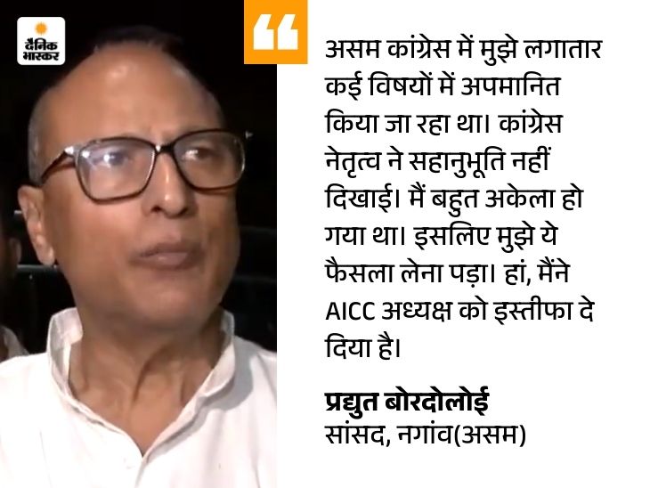 असम के कांग्रेस से लोकसभा सांसद प्रद्युत बोरदोलोई ने मंगलवार को पार्टी से इस्तीफा दे दिया। यह इस्तीफा राज्य में विधानसभा चुनावों से ठीक 20 दिन पहले आया है। राज्य मीडिया विभाग के अध्यक्ष बेदाब्रत बोरा ने PTI को बताया कि बोरदोलोई ने अपना इस्तीफा पत्र कांग्रेस अध्यक्ष मल्लिकार्जुन खड़गे को भेज दिया है।