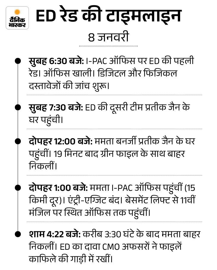 ममता वहां कुछ देर रुकीं। जब बाहर निकलीं, तो उनके हाथ में एक हरी फाइल दिखाई दी। इसके बाद वे I-PAC के ऑफिस भी गईं। उन्होंने कहा- गृहमंत्री मेरी पार्टी के दस्तावेज उठवा रहे हैं। ED ने कहा कि पश्चिम बंगाल में 6 और दिल्ली में 4 ठिकानों पर छापेमारी की गई।