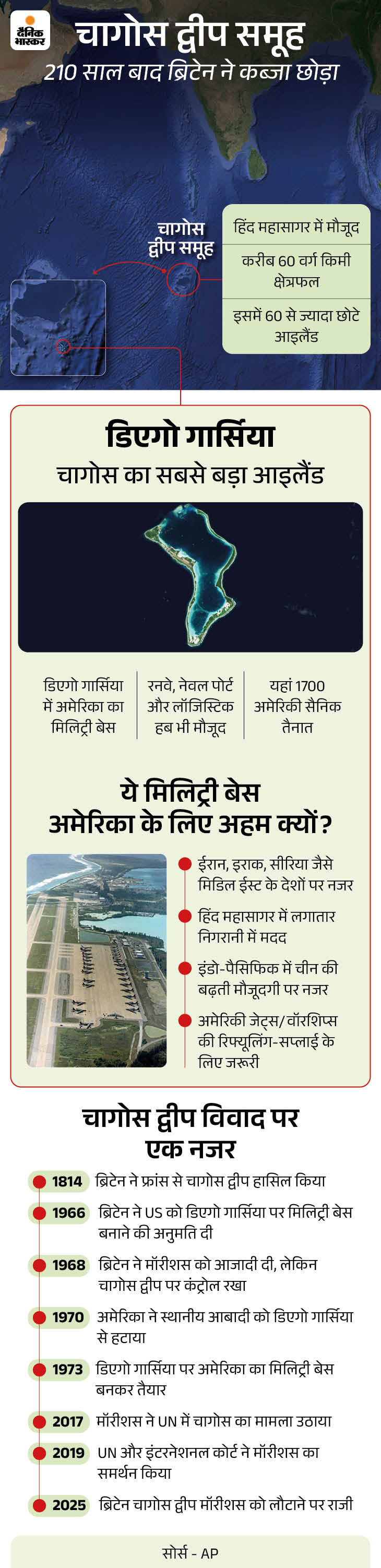 ट्रम्प ने चागोस आइलैंड्स को लेकर ब्रिटेन की आलोचना की है। उन्होंने अपने सोशल मीडिया प्लेटफॉर्म ट्रुथ सोशल पर गुरुवार को लिखा कि 100 साल की लीज किसी देश के मामले में ठीक फैसला नहीं है। डिएगो गार्सिया जैसा ठिकाना छोड़ना बहुत बड़ी गलती होगी।