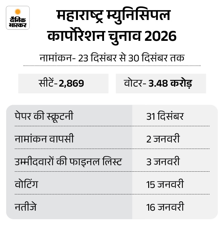 महाराष्ट्र में बीएमसी सहित 29 नगर निगम चुनाव के लिए नामांकन प्रक्रिया मंगलवार से शुरू हो गई है। वोटिंग 15 जनवरी को होनी है। काउंटिंग 16 जनवरी को होगी।