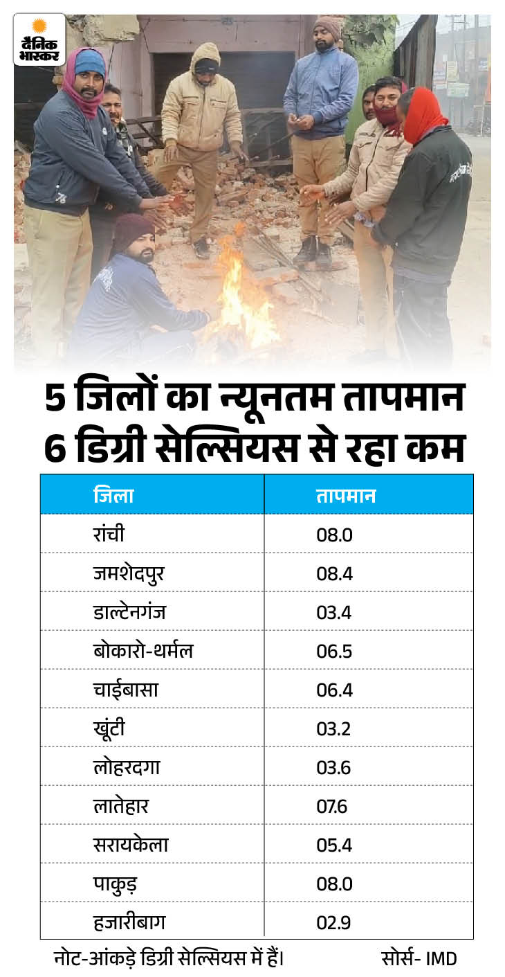 मौसम विभाग ने सुबह-शाम के वक्त घर से बाहर निकलने वालों को सजगता बरतने को कहा है। झारखंड में शीतलहर की स्थिति फिलहाल बनी रहेगी।