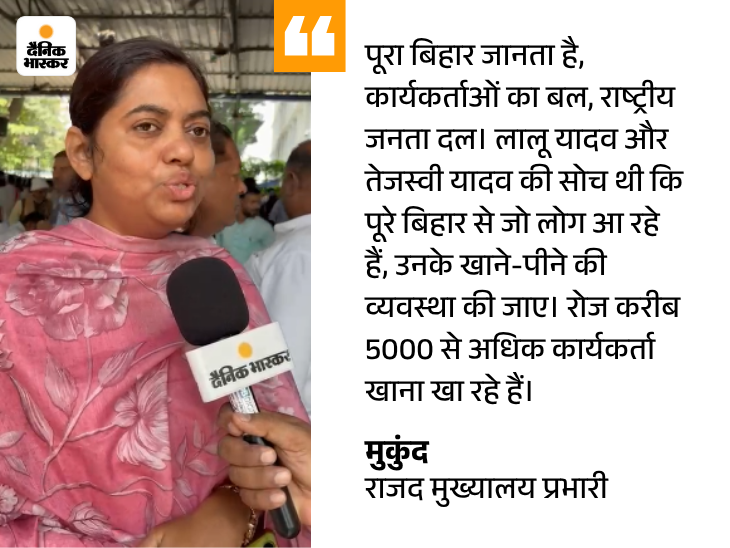 वीरचंद पटेल पथ पर राजद कार्यालय में पिछले चार-पांच दिनों से भोज चल रहा है। राजद की मुख्यालय प्रभारी मुकुंद सिंह कहती हैं, ‘हर दिन चार हजार लोगों को यहां भोजन कराया जा रहा है। सुबह 10-11 बजे से भोजन कराया जा रहा है। भोजन के मेनू है- दाल-भात, सब्जी, पापड़-तिलौड़ी।