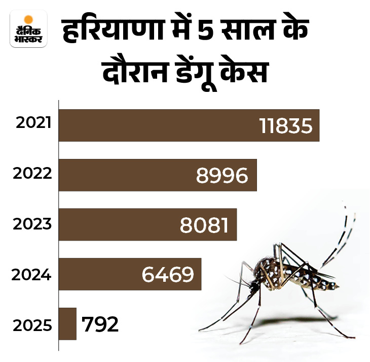 हरियाणा में डेंगू और मलेरिया के मामले लगातार बढ़ रहे हैं। स्वास्थ्य विभाग की ताजा रिपोर्ट के अनुसार अब तक डेंगू के 792 और मलेरिया के 163 और चिकनगुनिया के 6 केस अब तक सामने आ चुके हैं।
