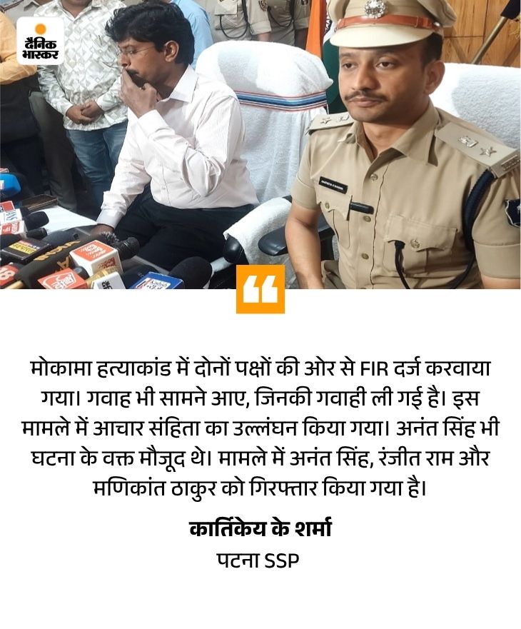 दोनों पक्षों ने एक-दूसरे पर केस दर्ज कराया है। गवाह भी सामने आए जिनकी गवाही ली गई है। घटना के दौरान आचार संहिता का उल्लंघन किया गया। प्रत्याशी वहां मौजूद थे। अनंत सिंह भी घटना के वक्त मौजूद थे। 3 लोगों को गिरफ्तार किया गया है। अनंत सिंह, रंजीत राम, मणिकांत ठाकुर को गिरफ्तार किया गया है। हत्या पूरी प्लानिंग के साथ की गई है।
