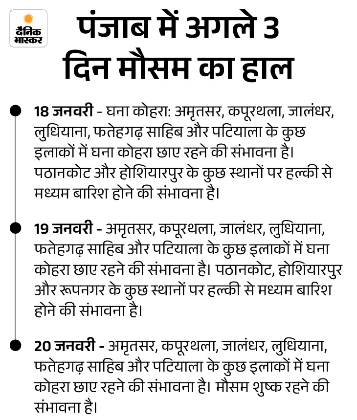 2 दिन 4 जिलों में बारिश की संभावना 18 और 19 जनवरी को गुरदासपुर, अमृतसर, होशियारपुर और रूपनगर में बारिश की संभावना है। 23 और 24 जनवरी को मूसलाधार बारिश होगी।