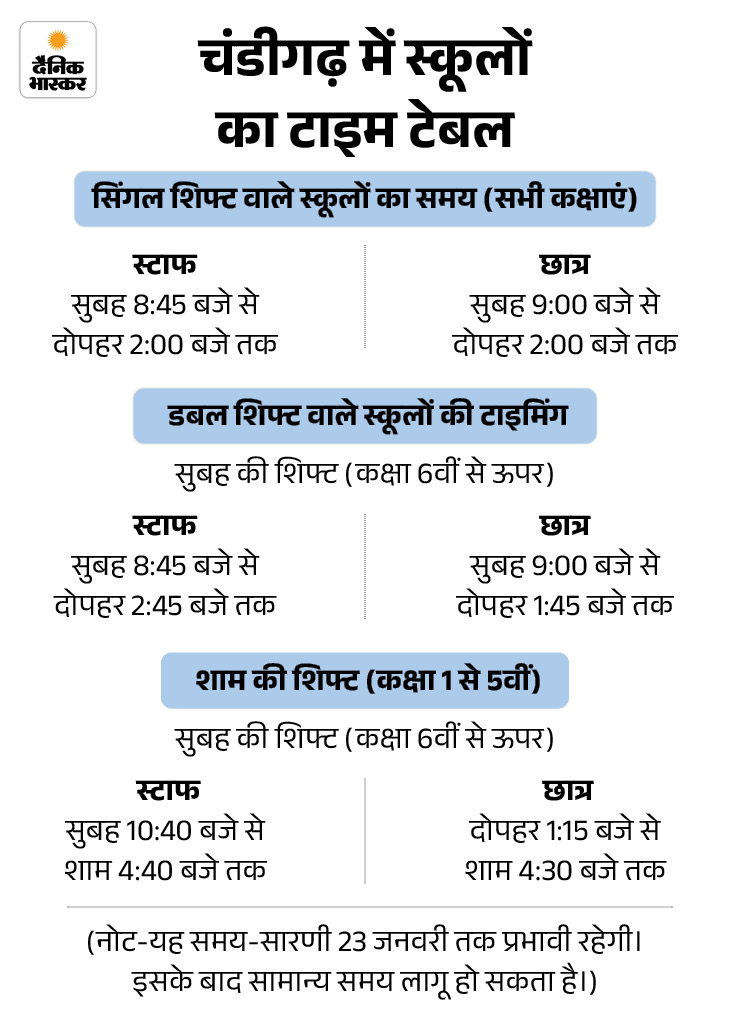 चंडीगढ़ में 19 जनवरी से खुलेंगे स्कूल चंडीगढ़ में सभी सरकारी, सहायता प्राप्त (एडिड) और मान्यता प्राप्त निजी स्कूलों में कक्षाएं 19 जनवरी 2026 (सोमवार) से दोबारा शुरू होंगी। इसको लेकर शनिवार को स्कूल शिक्षा विभाग ने आदेश जारी कर दिया।