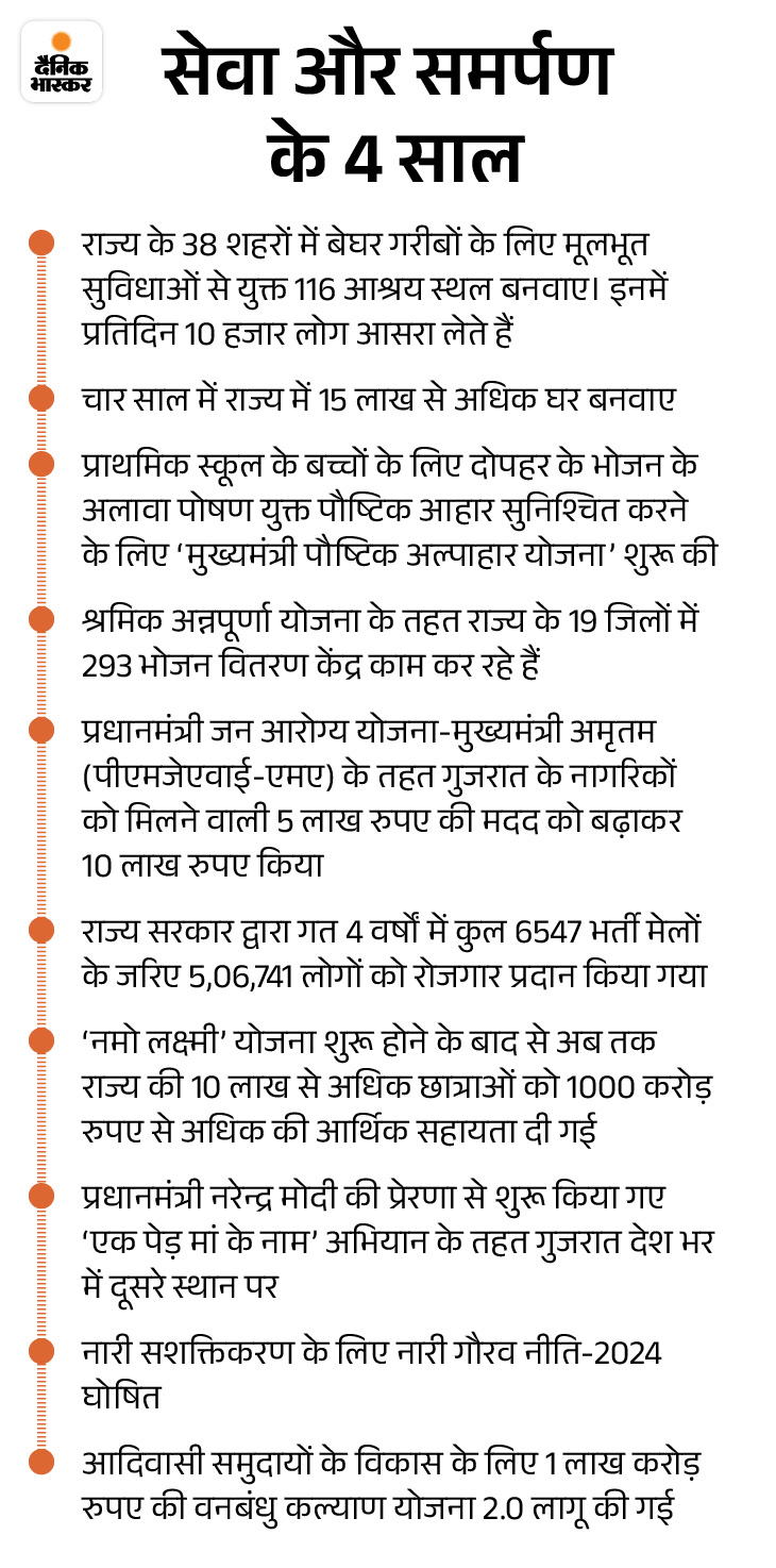 13 सितंबर, 2025 को मुख्यमंत्री भूपेंद्र पटेल ने अपने कार्यकाल के चार वर्ष पूरे कर लिए। ये चार वर्ष सेवा-समर्पण, सुशासन, औद्योगिक विकास और नीति-निर्माण के रहे हैं। प्रधानमंत्री नरेंद्र मोदी ने गुजरात को विकास के इंजन के रूप में स्थापित किया था, जिसके