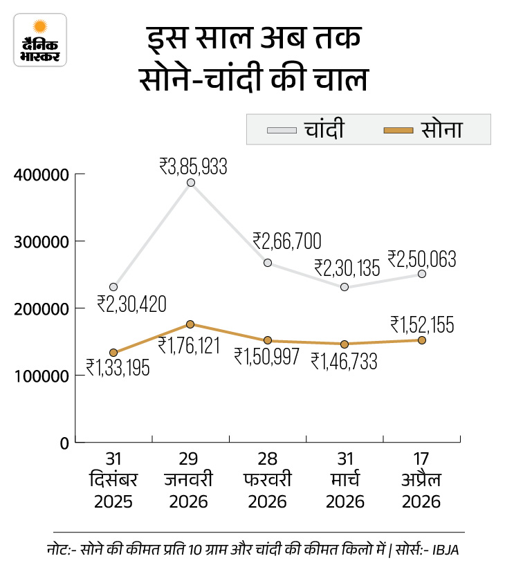 इस साल सोने-चांदी की कीमत में लगातार उतार-चढ़ाव देखने को मिल रहा है। सोना 2026 में अब तक 19 हजार रुपए और चांदी 20 हजार रुपए महंगी हुई है। 31 दिसंबर 2025 को 10g सोना 1.33 लाख रुपए पर था, जो अब 1.52 लाख रुपए पर पहुंच गया है।