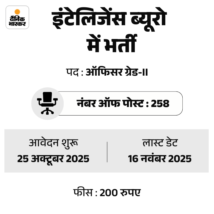 सरकारी नौकरी: इंटेलिजेंस ब्यूरो में 258 पदों पर भर्ती के लिए आवेदन की आखिरी तारीख आज, इंजीनियर तुरंत करें अप्लाई