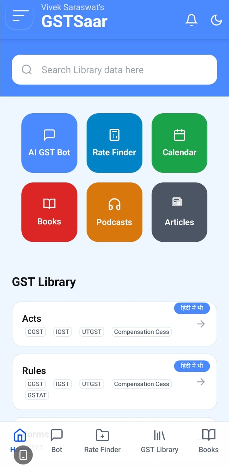 ‘GSTSaar’ पर जीएसटी लिटिगेशन विषय की ई-बुक्स उपलब्ध हैं। देश के प्रतिष्ठित विशेषज्ञों के लेख नियमित रूप से प्रकाशित किए जाते हैं। साथ ही जीएसटी से जुड़ी ताज़ा खबरों का अपडेट भी मिलता रहता है, जिससे उपयोगकर्ता हमेशा नई जानकारी से जुड़े रहते हैं।