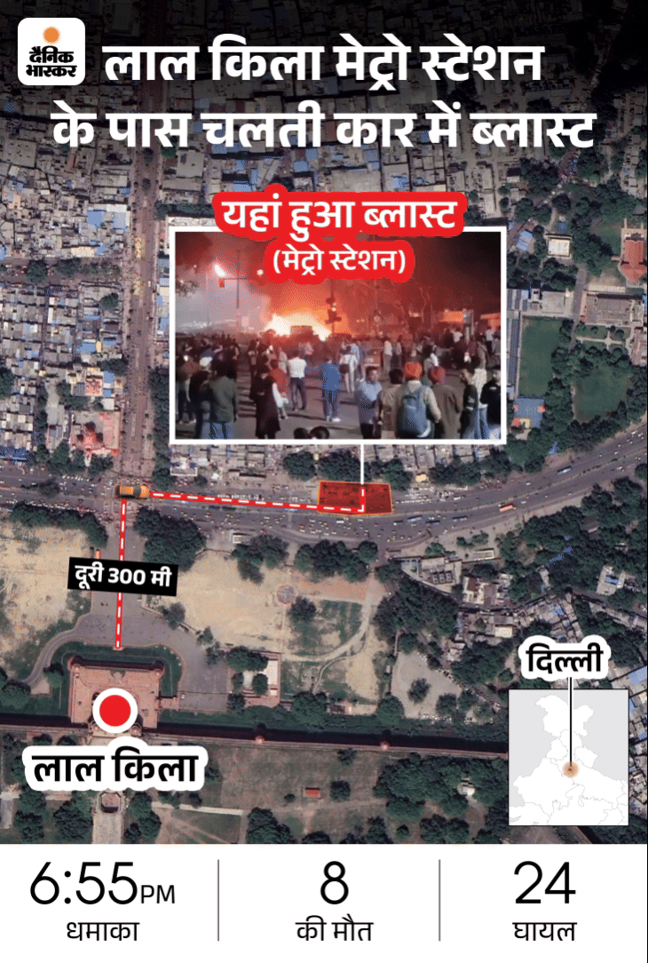 दिल्ली में लाल किले के पास चलती कार में धमाका:10 की मौत, 24 घायल, दिल्ली, मुंबई, यूपी और हरियाणा में हाई अलर्ट