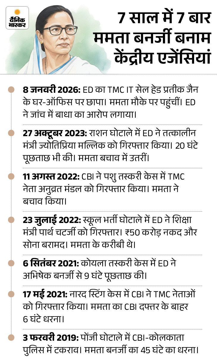 - सीएम और पुलिस अधिकारियों ने मौके पर पहुंचकर ED अधिकारियों को धमकाया। प्रतीक जैन के आवास और I-PAC ऑफिस में चल रही तलाशी को आगे बढ़ने नहीं दिया।