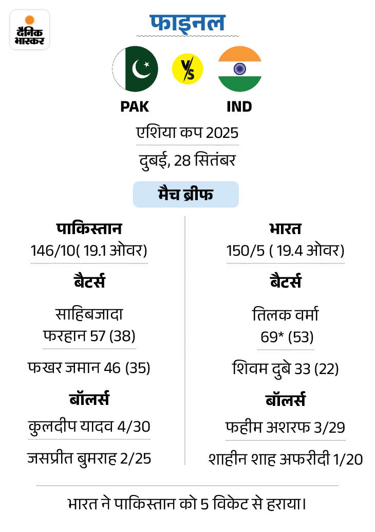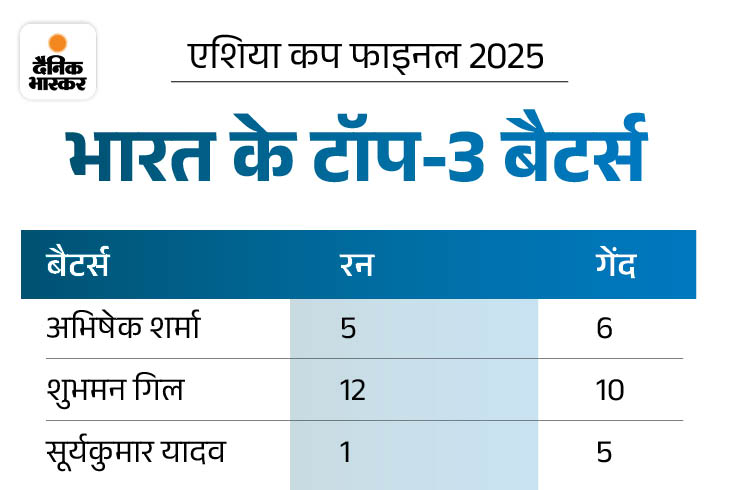 20 रन पर गिर गए थे 3 विकेट भारतीय टीम 147 रन के टारगेट का पीछा करते हुए 20 रन पर तीन विकेट गंवा चुकी थी। फाइनल से पहले हर मैच में धूम मचाने वाले अभिषेक शर्मा 5 रन बनाकर आउट हो गए। कप्तान सूर्यकुमार यादव 1 रन ही बना सके। शुभमन गिल भी 12 के आंकड़े से आगे नहीं बढ़े।