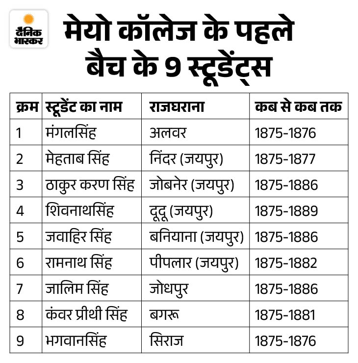 पहले स्टूडेंट थे अलवर के राजकुमार मंगल सिंह मेयो कॉलेज के प्रिंसिपल सौरव सिन्हा ने बताया- मेयो कॉलेज के पहले स्टूडेंट अलवर के राजकुमार मंगल सिंह थे। जब वे आए तो पूरा एक गांव बस गया था। उनके साथ शाही लवाजमा भी साथ था। 300 नौकर उनकी सेवा के लिए साथ आए थे। हाथी, घोड़े, ऊंट, पालकी के अलावा पिंजरे में टाइगर सहित अन्य जानवर भी थे। राजकुमार मंगल सिंह करीब एक डेढ़ साल यहां रहे और पढ़ाई की।