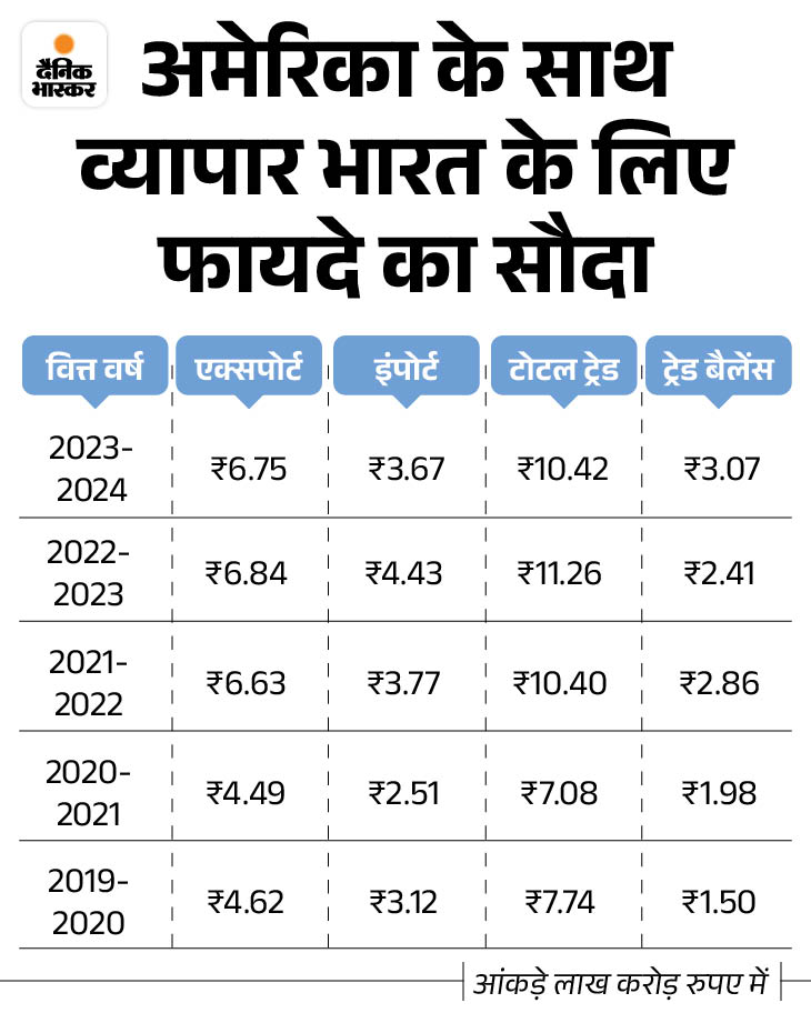 कॉमर्स मिनिस्ट्री का यह बयान एक्सपोर्टर्स के लिए उम्मीद की किरण है, जो 50% टैरिफ हटने की उम्मीद कर रहे हैं। अमेरिका भारत का सबसे बड़ा एक्सपोर्ट मार्केट है, जहां पिछले साल 86 बिलियन डॉलर यानी 7.54 लाख करोड़ का एक्सपोर्ट हुआ था। जिसमें से 40-45% सामान पर अभी ज्यादा टैरिफ लागू है।