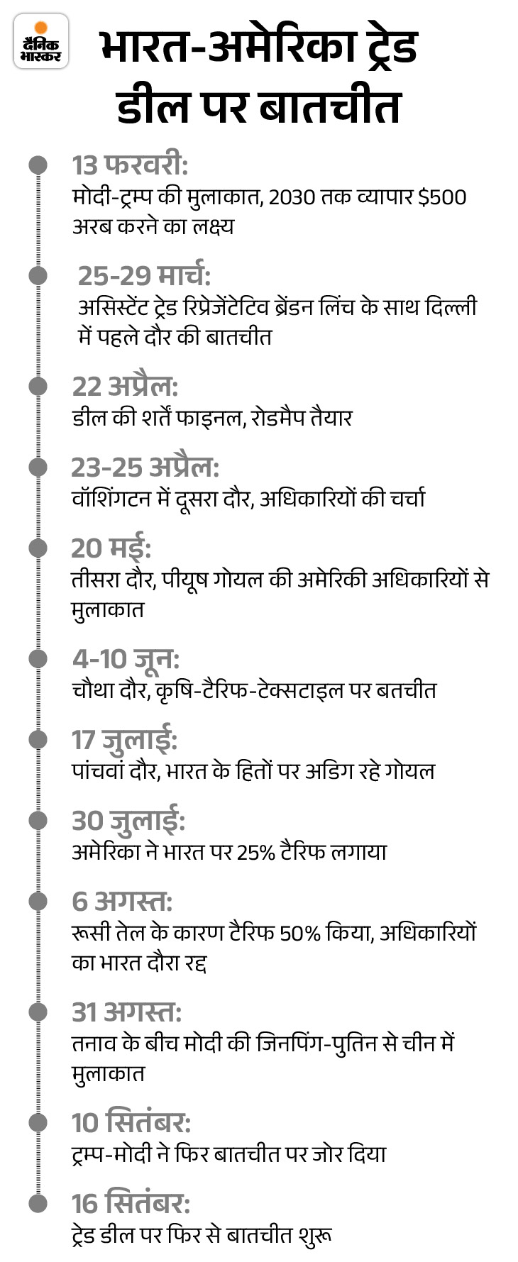 वहीं भारत और अमेरिका के बीच ट्रेड डील पर चर्चा को लेकर पॉजिटिव संकेत मिले हैं। ट्रम्प के 50% टैरिफ लगाए जाने के बाद पहली बार ट्रेड डील पर बातचीत के लिए मंगलवार (16 सितंबर) को अमेरिकी दल भारत पहुंचा था। अमेरिकी टीम के साथ मीटिंग के बाद कॉमर्स मिनिस्ट्री ने एक बयान में कहा था कि भारत और अमेरिका ने ट्रेड डील को जल्द से जल्द फाइनल करने के अपनी कोशिशें तेज करने का फैसला किया है।