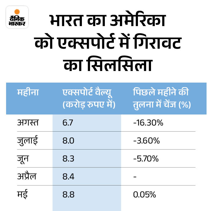 भारत का अमेरिका को होने वाला एक्सपोर्ट अगस्त में लगातार तीसरे महीने गिरा है। अगस्त में एक्सपोर्ट 16.3% घटकर 6.7 बिलियन डॉलर यानी 58,816 करोड़ रुपए पर आ गया, जो 2025 की अब तक की सबसे बड़ी मंथली गिरावट है।