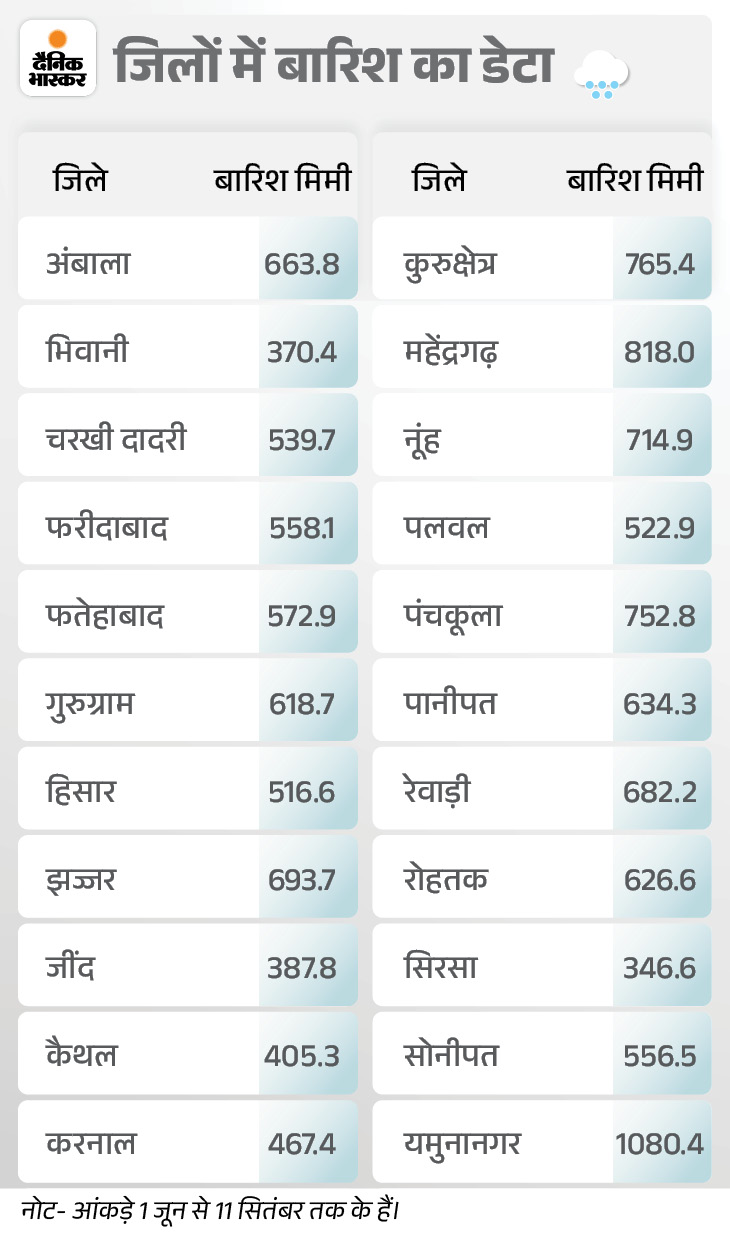 44 प्रतिशत अधिक हुई है बारिश भारतीय मौसम विभाग के अनुसार हरियाणा में अब तक सामान्य से 44 प्रतिशत ज्यादा बारिश दर्ज की गई है। 11 सितंबर तक औसतन 391.6 एमएम बारिश होनी चाहिए थी, लेकिन प्रदेश में 564.6 एमएम बारिश दर्ज की जा चुकी है। इस सीजन सबसे ज्यादा बारिश यमुनानगर में 1080.4 एमएम और महेंद्रगढ़ में 818.0 एमएम बारिश दर्ज की गई है, जबकि सबसे कम बारिश सिरसा में 346.6 और भिवानी में 370.4 एमएम बारिश दर्ज हुई है।