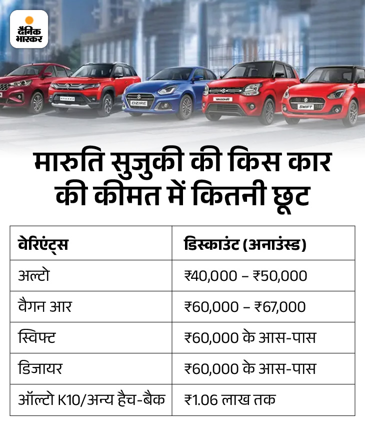 मारुति सुजुकी: देश की सबसे बड़ी कार मेकर कंपनी मारुति सुजुकी त्योहारी सीजन से पहले कंज्यूमर्स के लिए भारी छूट पर विचार कर रही है। मारुति के चेयरमैन आरसी भार्गव ने कहा कि GST में राहत का सीधा फायदा छोटी कारों को होगा और इस साल सेल्स में 10% की बढ़ोतरी का अनुमान है। हालांकि, लग्जरी मॉडलों की कीमतों में लगभग ₹5 लाख की कमी आ सकती है, लेकिन ज्यादा कटौती हैच-बैक और कॉम्पैक्ट सिडान के लिए ही है।