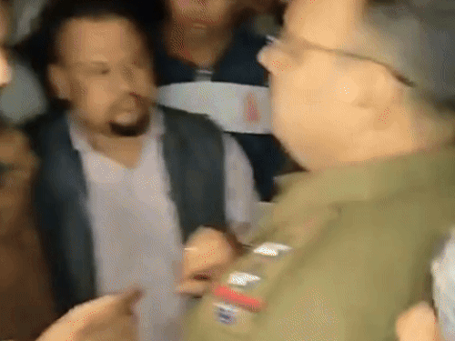 प्रदर्शनकारी पुलिस से बहस करते हुए।