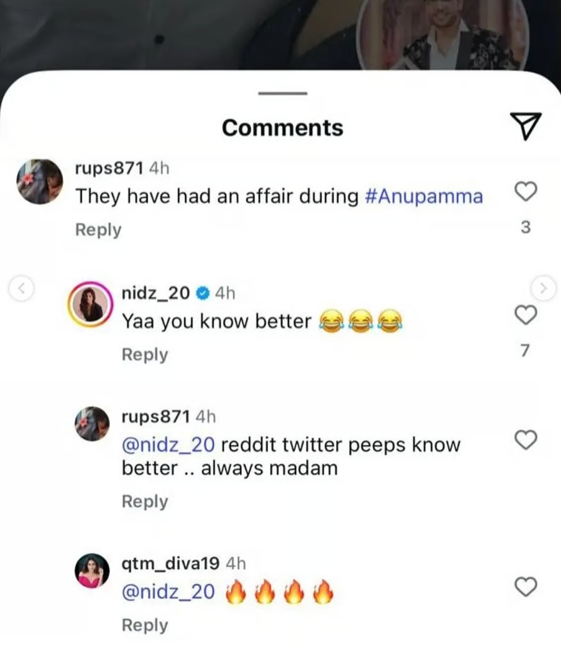 यूजर ने कमेंट करते हुए लिखा कि अनुपमा के दौरान उनका अफेयर चल रहा था। जैसे ही निधि ने यह कमेंट पढ़ा उन्होंने तुरंत रिएक्ट करते हुए यूजर को करारा जवाब दिया और लिखा, हां, तुम बेहतर जानते हो। साथ ही उन्होंने हंसने वाली इमोजी भी लगाई।