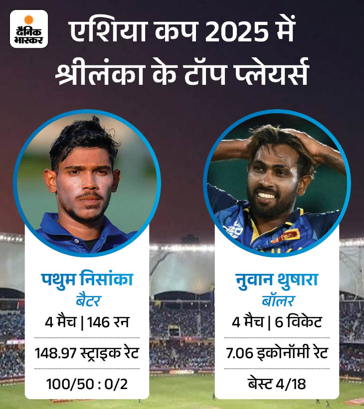 श्रीलंका को पाथुम निसांका से उम्मीद दूसरी ओर, श्रीलंका के लिए दासुन शनाका ने बांग्लादेश के खिलाफ पांचवें नंबर पर अच्छी बल्लेबाजी की। ग्रुप स्टेज में लगातार दो अर्धशतक जमाने वाले पाथुम निसांका अब लय दोबारा हासिल करने के लिए जूझ रहे हैं। कुसल मेंडिस और कामिल मिशारा अच्छे फॉर्म में है। गेंदबाजी में तेज गेंदबाज नुवान तुषारा ने प्रभावित किया है जो टूर्नामेंट में छह विकेट ले चुके हैं। स्पिनर वानिंदू हसरंगा, दुष्मंता चमीरा, चरिथ असलंका और दासुन शनाका ने भी योगदान दिया है।