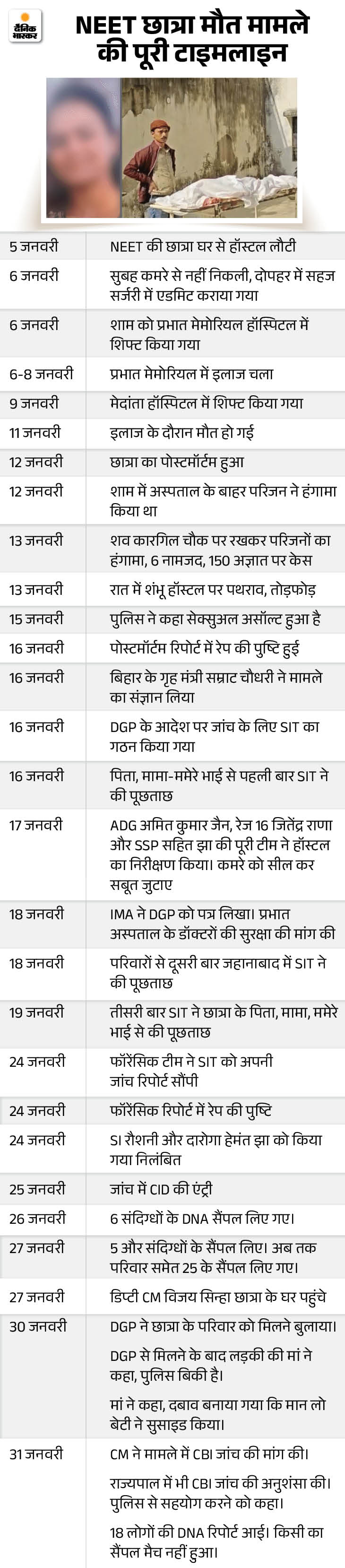 - दूसराः प्रभात मेमोरियल हॉस्पिटल की नर्स ने मुझे बताया कि शाम में उसे प्रभात हॉस्पिटल लाया गया। बच्ची को 6 जनवरी को बेहोश लाया गया, 8 को होश आया। 6 को घटना हुई, 9 तक FIR नहीं करते है। कौन-कौन दोषी है।