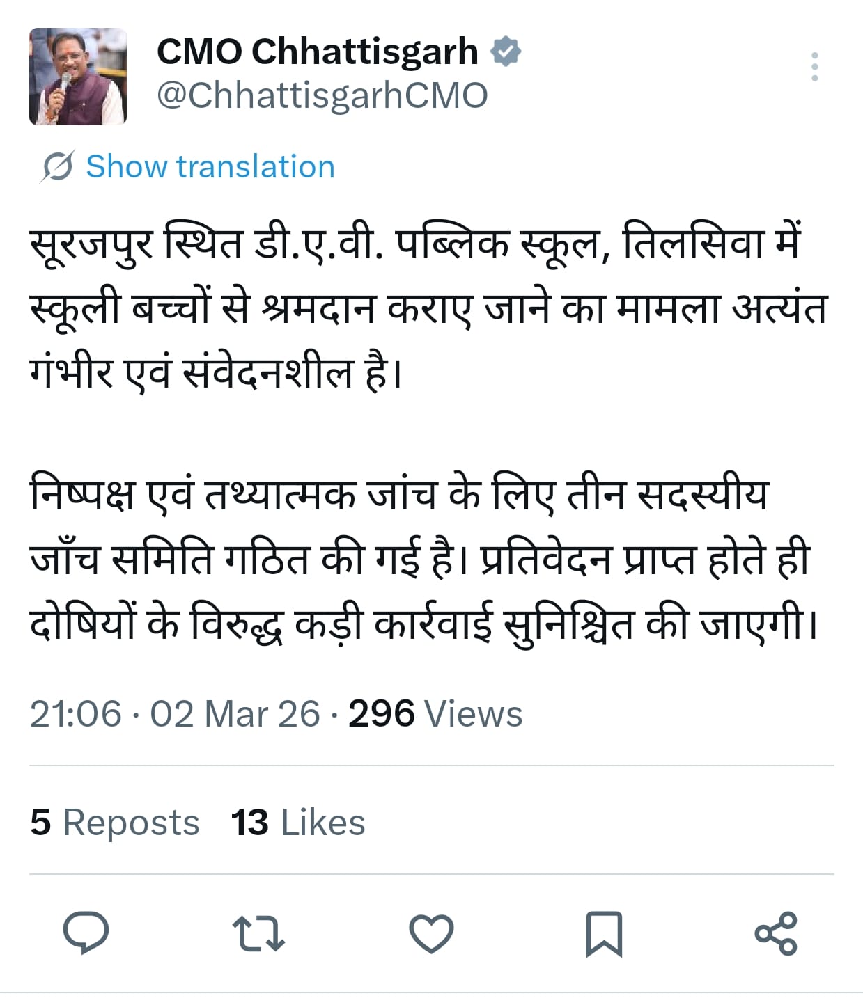 छत्तीसगढ़ सीएमओ की तरफ से X पर लिखा गया कि, सूरजपुर स्थित डी.ए.वी. पब्लिक स्कूल तिलसिवा में स्कूली बच्चों से श्रमदान कराए जाने का मामला अत्यंत गंभीर और संवेदनशील है। निष्पक्ष और तथ्यात्मक जांच के लिए तीन सदस्यीय जांच समिति गठित की गई है। प्रतिवेदन प्राप्त होते ही दोषियों के खिलाफ कड़ी कार्रवाई सुनिश्चित की जाएगी।