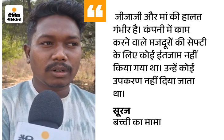 परिवार के सदस्य समयलाल खड़िया ने बताया कि हादसे में बड़ा भाई साहेबलाल खड़िया, भतीजा शिव खड़िया, बहू उदासिनी 2 साल से प्लांट में काम कर रहे थे। बच्ची को अपने साथ ले जाते थे। घटना वाले दिन भी बच्ची को लेटाकर सभी काम कर रहे थे।