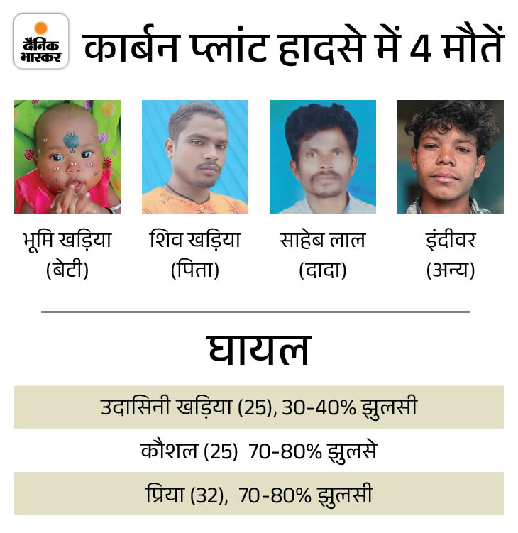 इस घटना में एक ही परिवार के चार लोग आग की चपेट में आए थे। साहेब लाल खड़िया (46) 80-90%, शिव खड़िया (27) 80-90%, उदासिनी खड़िया (25) 30-40% और भूमि खड़िया (9 माह) 80-90% झुलस गई थी। बच्ची ने इलाज के दौरान दम तोड़ दिया। मां उसे अपने साथ प्लांट में ले जाती थी। पति शिव खड़िया की मंगलवार देर रात मौत हुई है।