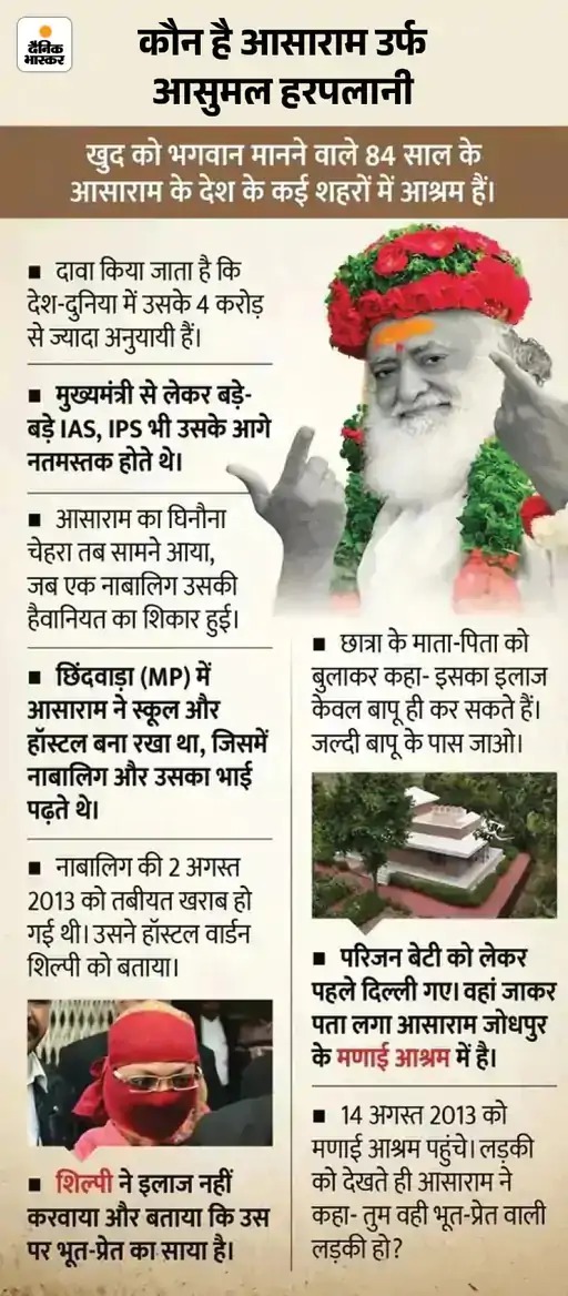 जोधपुर कोर्ट: आसाराम को जोधपुर पुलिस ने इंदौर के आश्रम से साल 2013 में गिरफ्तार किया था। इसके बाद से आसाराम जेल में बंद था। पांच साल तक लंबी सुनवाई के बाद 25 अप्रैल 2018 को कोर्ट ने आसाराम को आजीवन कारावास की सजा सुनाई थी। गांधीनगर कोर्ट: आसाराम के खिलाफ गुजरात के गांधीनगर में आश्रम की एक महिला ने रेप का मामला दर्ज करवाया था। कोर्ट ने 31 जनवरी 2023 को इस मामले में आसाराम को आजीवन कारावास की सजा सुनाई थी।
