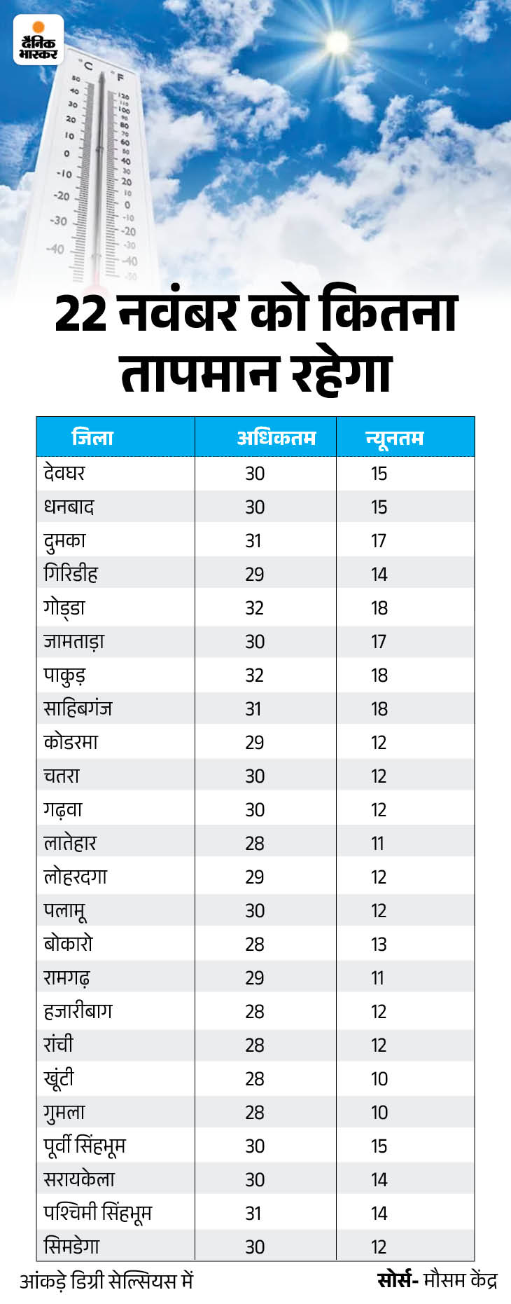 मौसम विज्ञान केंद्र रांची ने झारखंड के सभी जिलों के लिए पांच दिनों का तापमान पूर्वानुमान जारी किया है। रिपोर्ट के मुताबिक 19 से 23 नवंबर के बीच अधिकतम और न्यूनतम तापमान में हल्का उतार–चढ़ाव देखने को मिलेगा। हालांकि, अधिकतर जिलों में दिन का तापमान सामान्य से थोड़ा अधिक बना रहेगा, जबकि रात में ठंड बढ़ने के संकेत हैं।