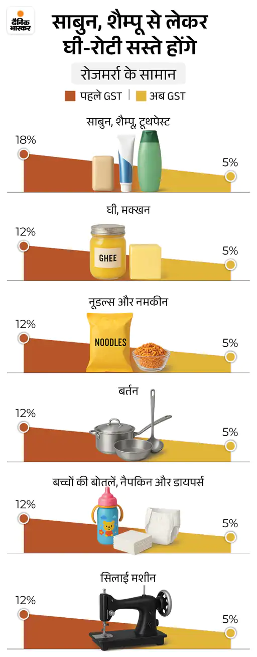 22 सितंबर से GST के 4 की जगह केवल दो स्लैब 5% और 18% होंगे। इससे आम जरूरत की चीजें जैसे साबुन, शैंपू के साथ AC, कार भी सस्ते होंगे। GST काउंसिल की 56वीं मीटिंग में इस पर फैसला लिया गया।