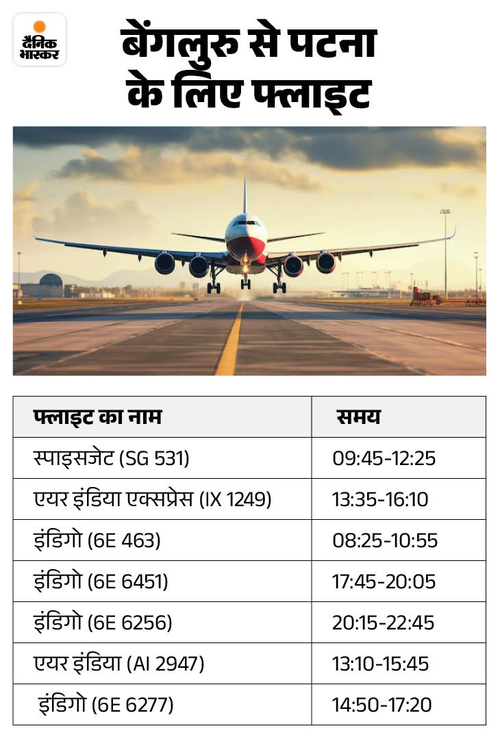 पटना से बेंगलुरु की दूरी 2 हजार किलोमीटर से अधिक है। यहां से पटना के लिए ट्रेन और विमान सेवाएं उपलब्ध हैं।