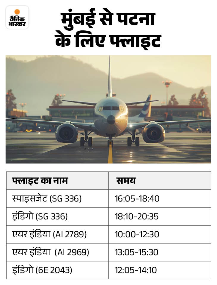 अगर आप मुंबई से बिहार आना चाहते हैं तो ट्रेन और विमान का इस्तेमाल सुविधाजनक होगा। मुंबई से पटना की दूरी 1747km है। दोनों शहर ट्रेन और फ्लाइट ले अच्छी तरह कनेक्टेड हैं। ट्रेन यात्रा में 26-42 घंटे लगते हैं।