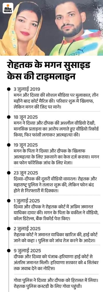 21 दिन के बेटे को लेकर ससुराल गई दिव्या जमानत याचिका में कहा कि 3 जुलाई 2019 को दिव्या और मगन ने प्रेम विवाह किया। परिवार ने शादी को स्वीकार नहीं किया तो दोनों रोहतक में किराए पर रहने लगे। 2021 में लड़के को जन्म दिया। जब लड़का 21 दिन का था तो दिव्या अपने ससुराल में रहने लगी। लेकिन ससुराल में मगन के परिवार ने जाति और दहेज के लिए दिव्या से झगड़ा करना शुरू कर दिया।